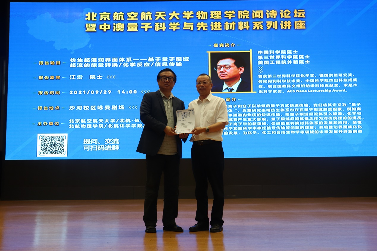 2021年9月29日下午,北京欧美大片ppt免费大全物理学院在沙河校区咏曼剧场成功举办“中·澳量子科学与先进材料系列讲座第三讲”暨“闻诗论坛第八讲”。本次论坛有幸邀请中国科学院院士、第三世界科学院院士、美国工程院外籍院士江雷教授作为主讲人。